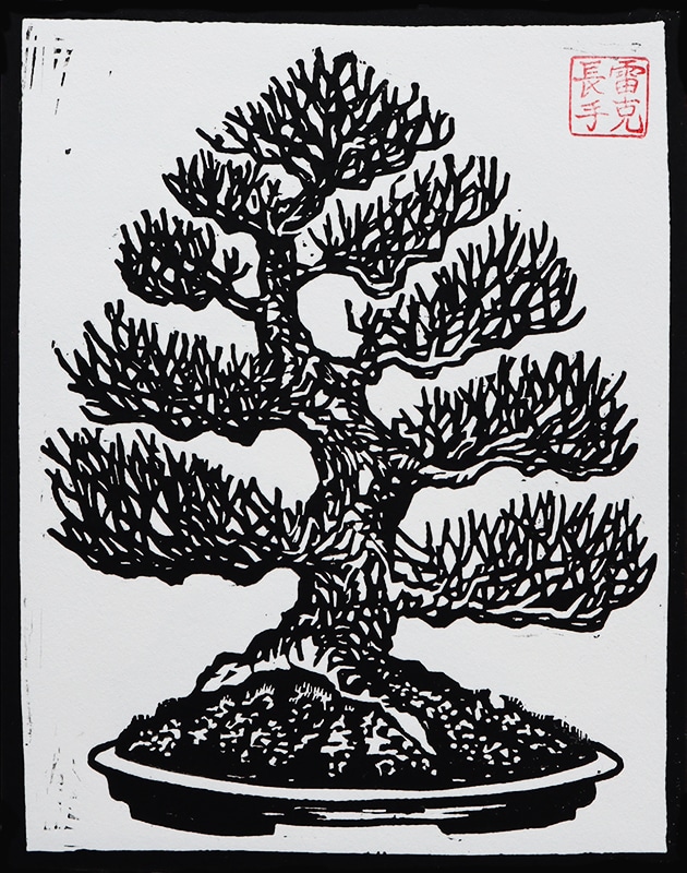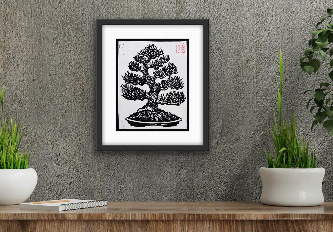 Euro Beech is a hand-carved woodblock print that embodies the strength and power of a fully mature bonsai tree. Its commanding presence speaks to endurance and resilience, while its balanced form reflects the harmony found in Japanese Aesthetics. The tree becomes a living sculpture — grounded, dignified, and filled with quiet energy.